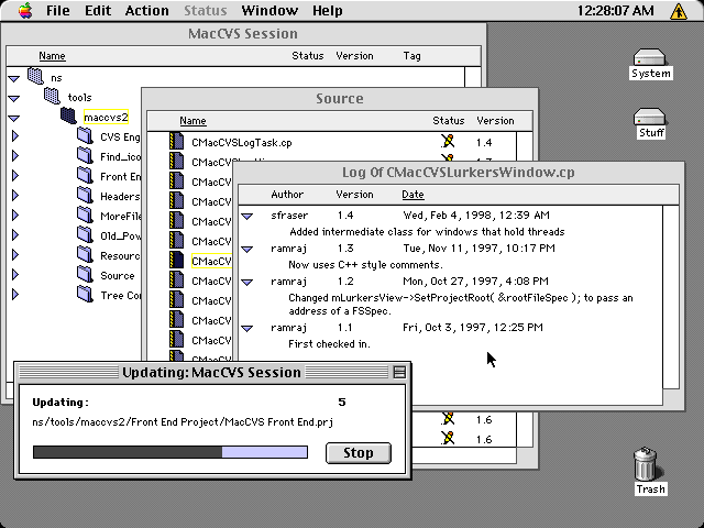 About MacCVSProMacCVSPro was a project, originally on MacCVS.org, and was originally sponsored by Netscape Communications Corporation and mozilla.org. Its mission was (and is) to provide free and open CVS client software for Mac OS by coordinating, building, and guiding the public sharing of such software originally developed at Netscape. At the moment, MacCVSPro is staffed by Glenn L. Austin, with the help of current and former Netscape employees including Ram Rajadhyaksha, Simon Fraser, Scott Collins, and Don Melton (some of these e-mail addresses may no longer work). We do have a mailing list, hosted here by SourceForge. About CVSCVS, the Concurrent Versions System, is a version control system which supports branching, multiple users, and remote collaboration. CVS maintains a history of all changes made to each directory tree it manages. Using this history, CVS can recreate past states of the tree, or show a user when, why, and by whom a given change was made. CVS has both client and server components which usually run on different systems and communicate via internet protocols. CVS client and server software is available in both source and binary form. The server is compatible with most Unix variants and clients exist for many platforms. Visit the CVS site for more information. About MacCVS ProMacCVS Pro is a completely free CVS client for Mac OS which is available at this site in both source and binary form. Its Finder-like interface with drag and drop capability is designed to be intuitive for non-technical users, and its features such as true CVS Log and Status commands are designed to be useful for professional software engineers. In addition, MacCVS Pro is multi-threaded so operations can be executed simultaneously. MacCVS Pro was originally developed at Netscape beginning in 1996 by engineers working on Navigator and other projects for use inside the company and has been known internally since then, simply, as MacCVS. Its copyright is owned by Netscape Communications Corporation and other contributors, and is now freely re-distributable under the terms of the GNU General Public License (GPL). MacCVS Pro (currently) shares no code with and is not derived from the CVS client for Mac OS developed by Mike Ladwig, Matthias Neeracher, and Alexandre Parenteau which is called MacCVS, nor is it related to other software called MacCVSClient. |
