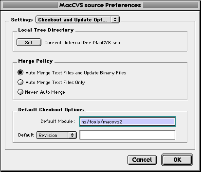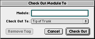 The Check Out To pop-up menu allows you to specify a date or tag revision. The Tip of Trunk option (which is the default) means that the latest versions of the source files will be checked out. To specify a specific revision, click on the pop-up menu, choose Other Tag and enter the standard CVS style tag information into the dialog box. A new menu item with that revision will be added to the Checkout To menu.