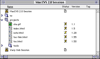 | This icon indicates that the status information for the particular file is corrupt or bad. If you are upgrading from MacCVS 1.x, you might see this because that version used a different file format for storing status information. |
