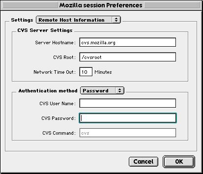 Note: In version 2.5 and later, you can elect not enter your password and have MacCVS Pro ask you for it when it connects to the server. This is useful for situations where you do not want your password stored in your session file.